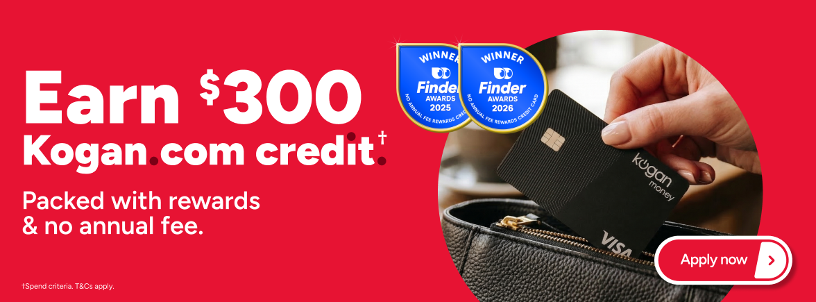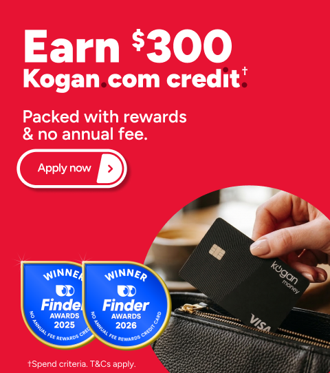 †To be eligible to receive the $300 Kogan.com Credit, you must apply for a new Kogan Money Credit Card, then spend $3,000 or more on eligible purchases using your new Card within 90 days from approval (spend period). Please note, purchases must be processed and charged to your Account within the spend period. Eligible purchases exclude Cash Advances, Balance Transfers, Special Promotions, refunds and Chargebacks, purchases of foreign currency and travellers cheques, transactions made in operating a business, payments to other credit card and other types of accounts, fees and charges such as interest and ATM charges, and transactions made using Rewards Points. The Kogan.com Credit will be credited to your Kogan.com account up to 10 weeks after the end of the spend period and will expire 12 months from the date it is applied. Your Kogan.com account will be set up upon approval of your application (if you don’t already have one). You will receive an email requesting that you activate your Kogan.com account and agree to the Kogan.com Terms and Conditions and Privacy Policy. Your Kogan Money Credit Card must remain open and in good standing (for example your Account is not in default, suspended, or closed), and your Kogan.com account must remain open for the Kogan.com Credit to be credited. If you have previously received a Kogan.com Credit from a Kogan Money Credit Card offer in the last 12 months, you will not be eligible for this offer. This offer commenced 1 April 2026. We reserve the right to withdraw or change the offer at any time without notice, at our discretion; is non-transferrable; can’t be used in conjunction with any other promotions or offers.